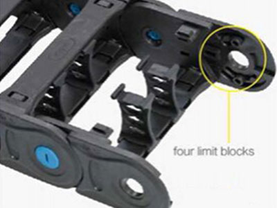 The use of 4 limit blocks and a lock catch have given the economic plastic cable chain system with a high strength and large load bearing capacity.