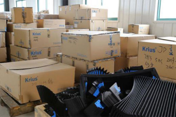 Different bellow cover types are stacked in the warehouse in different areas. Tags are used to label each section.